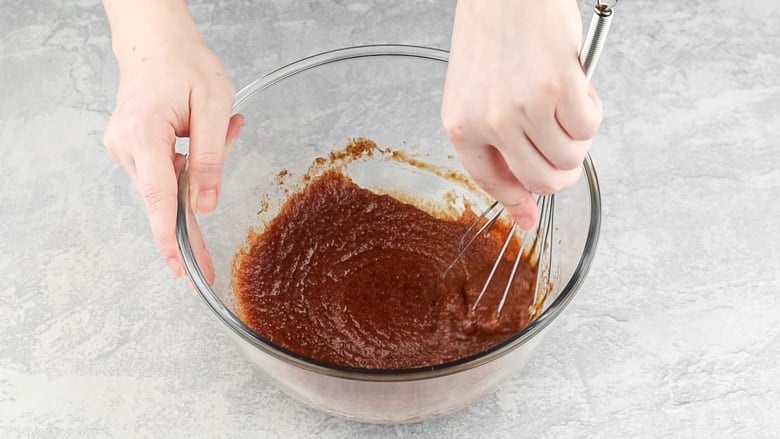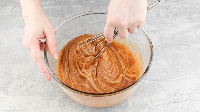 - In a separate large bowl, whisk together the melted butter and sugars until combined.