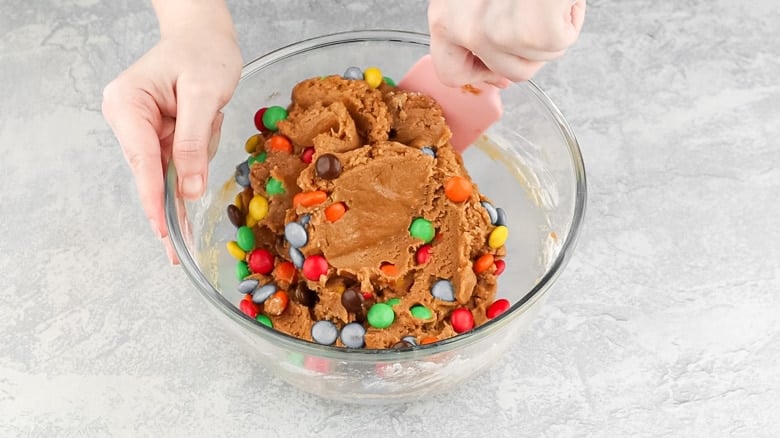 - Add the dry ingredients, and mix until just combined. Fold in the M&M’s.